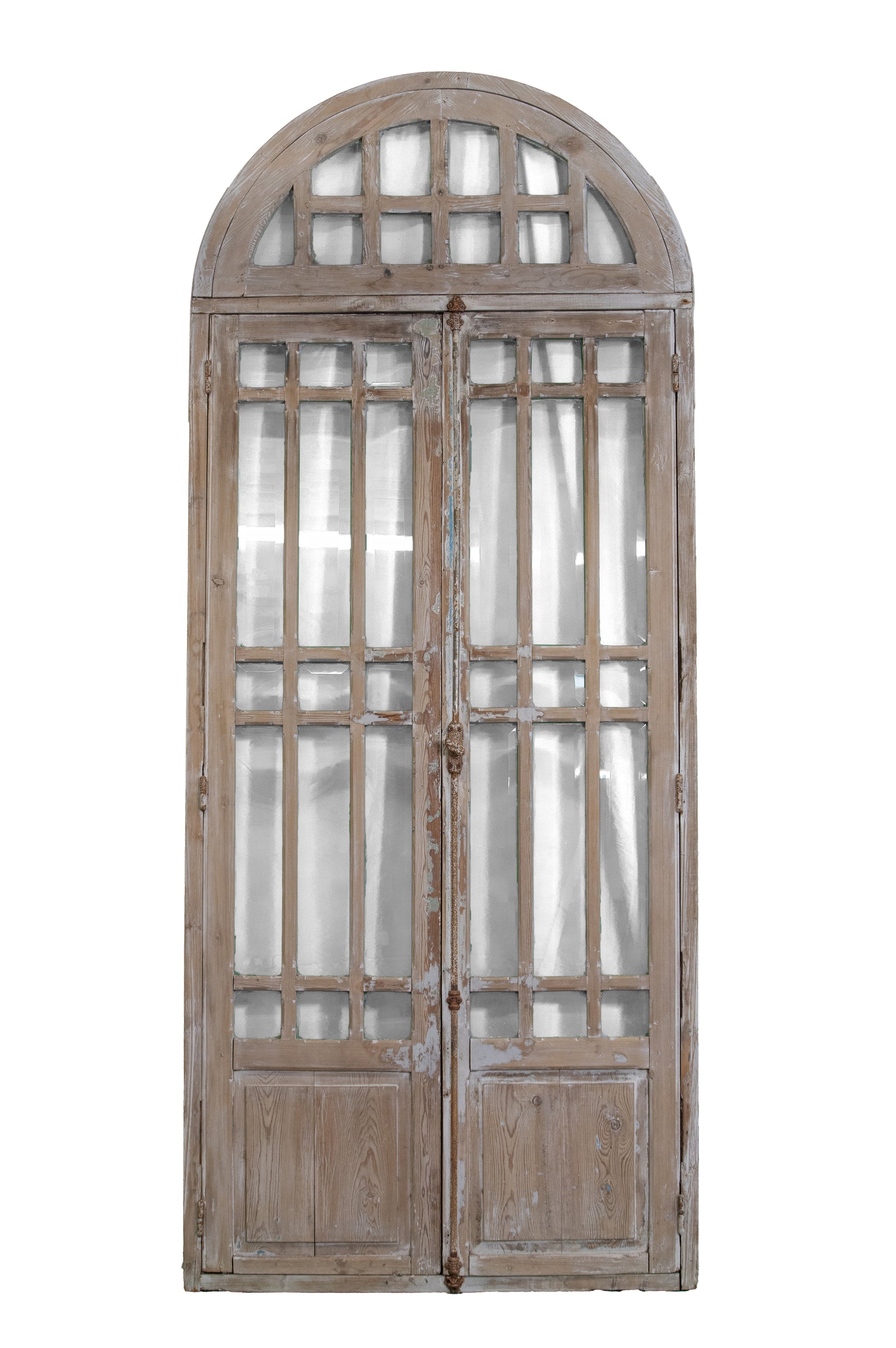 European Vintage mirrored doors. Multi beveled mirror panes with arched transom and antique hardware.